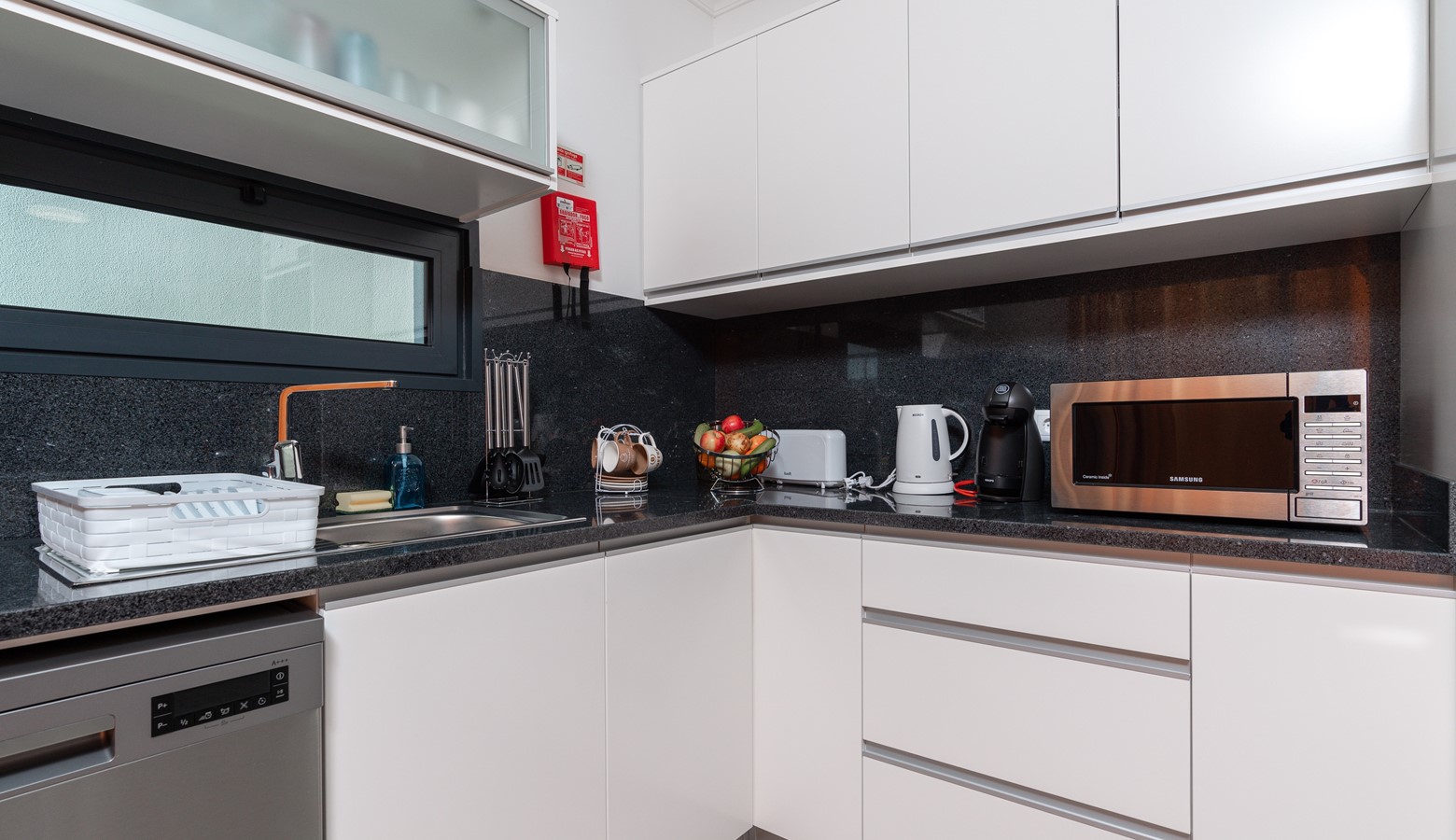 dishwasher, expresso coffee machine, kettle, toaster.